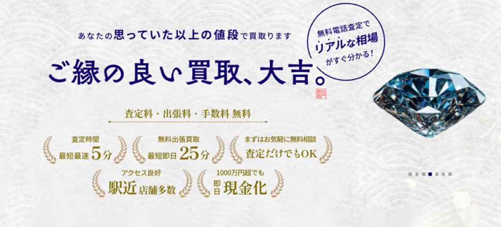 全国に1,400以上の店舗数を運営するおたからやでは、宝石の買取実績も豊富です。ダイヤモンドやサファイア、エメラルドといった、数百万円をこえる高価買取を実施しており、店頭での取引なら即日現金買取も可能。