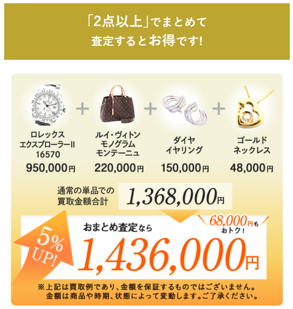 例えば「なんぼや」では、2点以上まとめて査定依頼をすると査定額アップするボーナスを常時実施しています。
