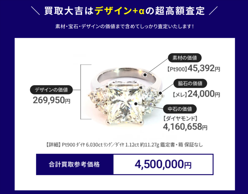 例えば、買取大吉では素材・宝石・デザインを加味した査定により高額査定を叶えています。