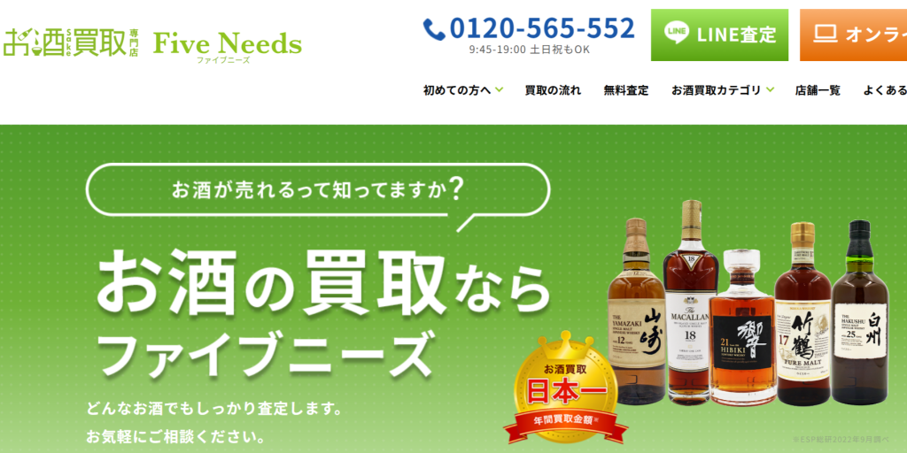 ファイブニーズは、ソムリエや「SAKE DIPLOMA」といったお酒に詳しいスタッフがそろっているお酒の買取専門店です。これまでに120万本以上を買取してきた実績を誇ります。