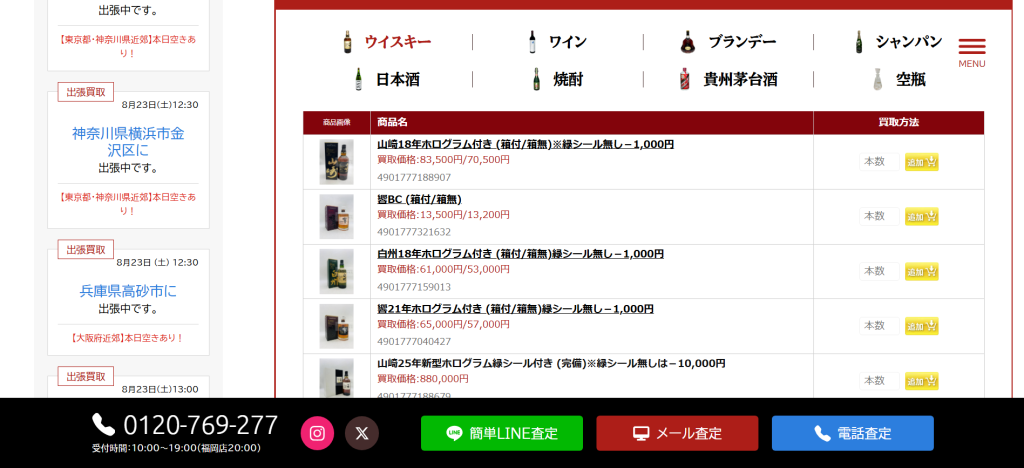 買取店の公式サイトで買取実績をチェックすることで、お酒の買取経験が豊富かや、高価買取が望めるかなどを確かめられます。買取実績の詳細が公式サイトで公開されていることは、自社の買取金額に自信を持っている証です。
