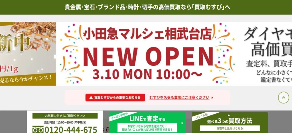| 買取むすび マーケットスクエア川崎イースト店 | 店舗情報 | 店頭、出張、、電話、LINE | 店頭、宅配、出張 | 無料 | 無料 | 可能 | 可能 | 10:00~19:00 | 株式会社むすび | 非上場 | 第451910009263号 | |